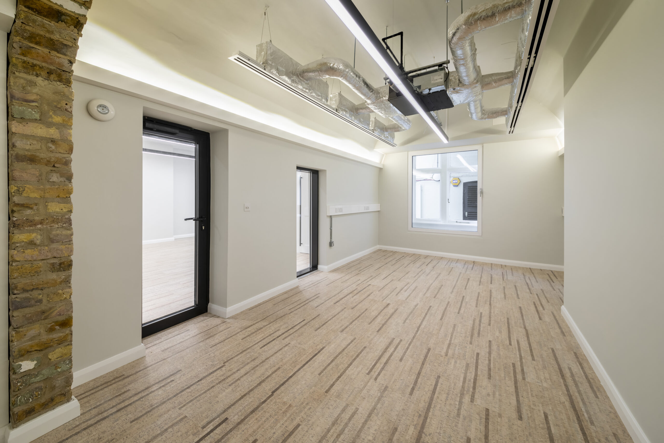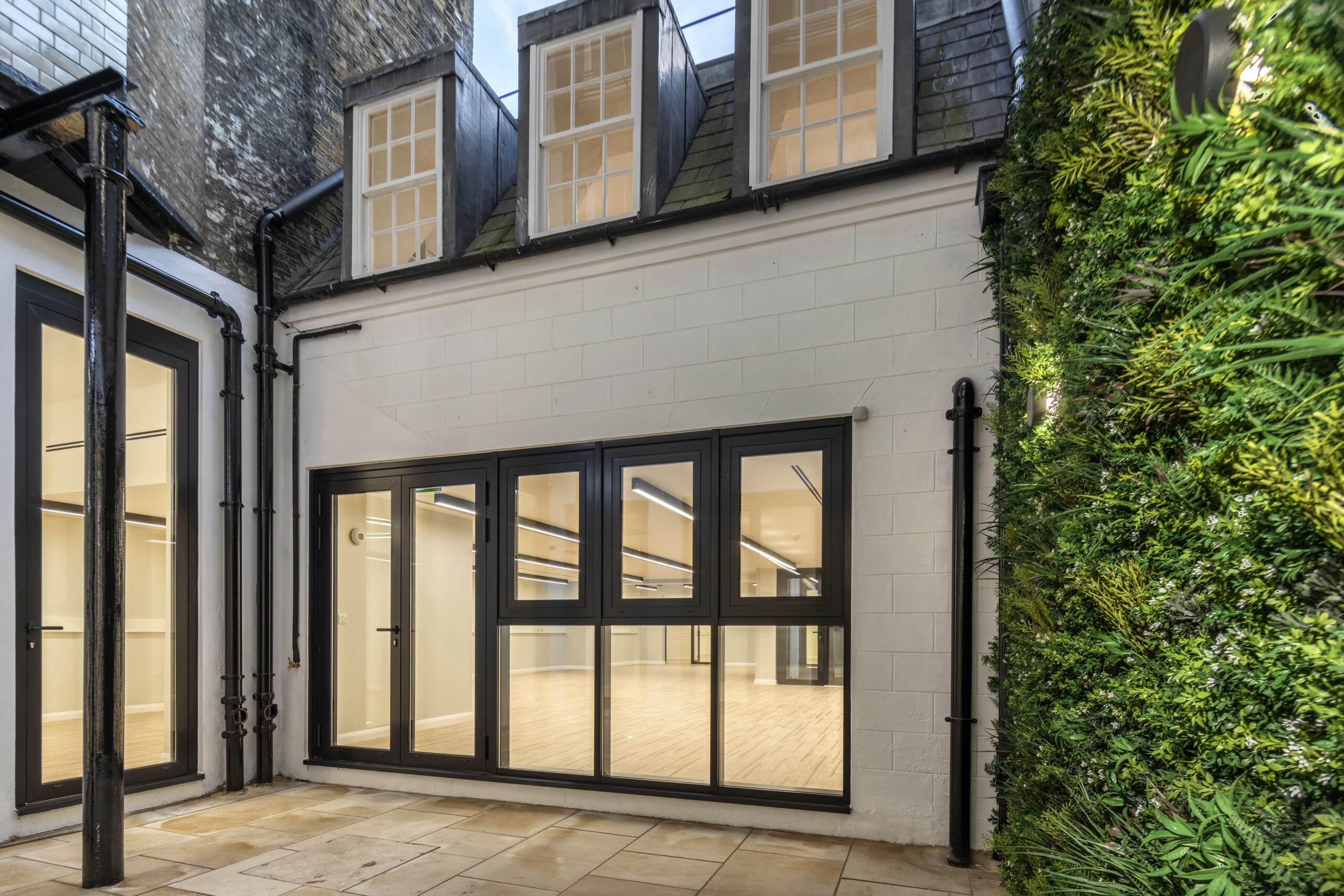 At garden level and within the 1980s extension, the team created open-plan offices designed to maximise natural light. Furthermore, exposed brick vaults and original irregular openings were retained to maintain both character and spatial quality. A newly created green courtyard provides a tranquil outdoor retreat. This courtyard strengthens the connection between interior and exterior spaces, adding real value for tenants.
